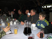 Pokotu Hubert w dniu dzisiejszym myśliwym nie dał i po ogłoszeniu zakończenia polowania wszyscy udali się do Gołębiewka, gdzie w nowo otwartej restauracji czekała wigilijna wierczerza. Czerwony barszcz, łosoś z rusztu, rybne zakąski i polskie pierogi, napoje zimne i gorące stanowiły wieczerzę dla członków koła i niektórych z ich najbliższych. Życzenia od siebie i zarządu Koła złożył prezes Piotr Gawlicki. Od rozmów i wspomniń myśliwskich było gwarno, ale jakoś brakło odwagi do zaintonowania kolęd. Może słabe muzycznie głosy potrzebowały animuszu, który dostarczała w przeszłości "woda ognista", ale dzisiaj, jak nigdy, zdecydowana większość nie piła. Trzech chętnych ledwo 1/2 l wypiło przez 2 godziny, co okrzyknieto najmniejsza ilością spożytą w historii Koła.