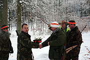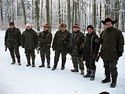 Na ostatnie polowanie zbiorowe w sezonie stawiło się 9 myśliwych i 2 stażystów. Mróz ca -15 stopni i znaczy śnieg w lesie stworzyły trudne warunki,