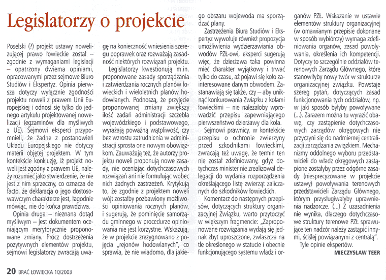 Mieczysław Teer komentuje drugi poselski projekt zmian ustawy, zgłoszony przez posłów samoobrony ( Brać Łowiecka nr 10/2003)